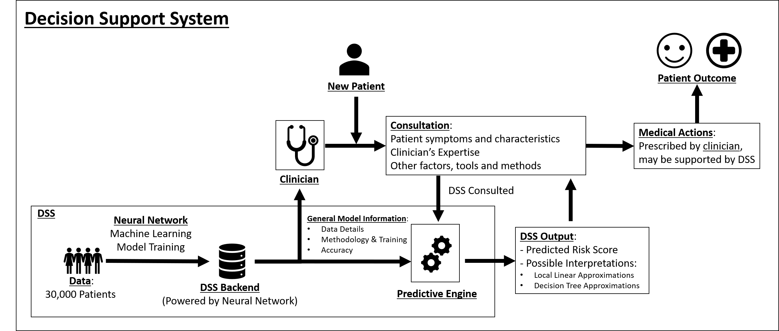 Note that the DSS is based on the Neural Network trained on data of over 30,000 patients. As new patients consult with their doctors, the clinician may refer to the decision-support system. The DSS will produce a predicted risk score based on the patient's characteristics, and may additionally output relevant local, high-interpretable linear or decision-tree models. The information produced may be utilised by a clinician to inform medical actions and impact patient outcomes.