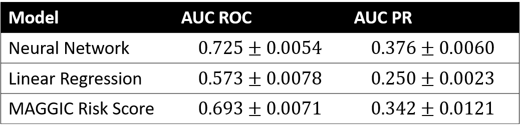 The neural network's accuracy values for both AUC-ROC and AUC-PR are much higher than the best linear regression model trained on the same data. They are also significantly higher than the accuracy of the MAGGIC Risk Score, an accepted risk score trained on the same data and developed by the European Society of Cardiology and other researchers. For information on the MAGGIC Risk Score, click here. The chart below summarises these results: