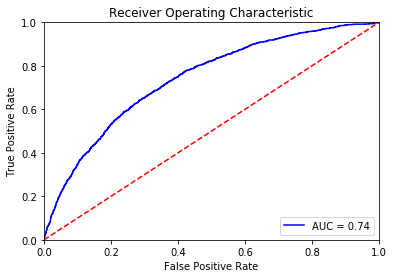 The model's AUC-ROC (area under the receiver operating curve), which is equal to the C-Index, is 0.725, with a standard deviation of 0.0054, averaged over 10 runs. This suggests high accuracy for the type of data, as we demonstrate below by comparing our network to a simple linear model and a risk score currently in use. For more information on the C-Statistic or AUC-ROC, click here.