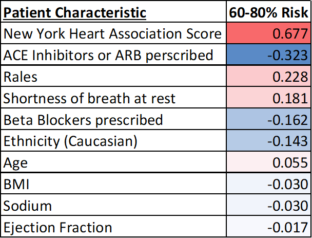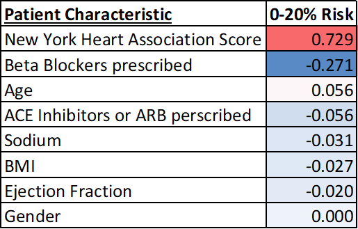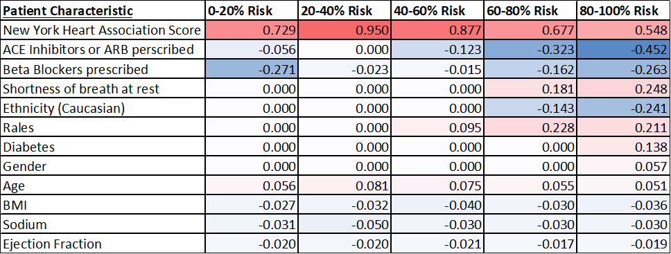 Since the linear approximation and the neural network models are so close, the value of each characteristic’s coefficient closely approximates their contribution to the variability in predicted patient risk score.